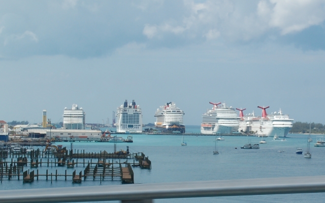 Looking back at six ships tied up in the Nassau harbor on our day-long visit.