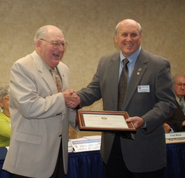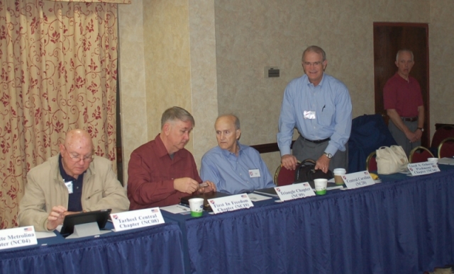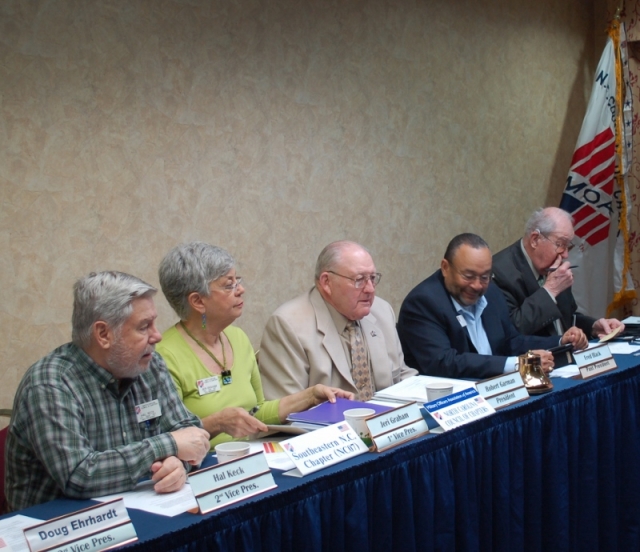 The business meeting of the North Carolina Council of Chapters was held on April 27, 2013. Pictured (L to R) are: Hal Keck, Jeri Graham, Bob Garman, Fred Black and Jack Overman.