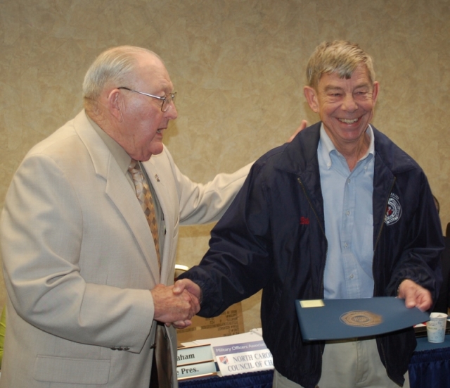 LTC Robert Garman, NC Council President presents an award to CAPT Doug Ehrhardt, New River Chapter President for Winner, Electronic Newsletter, MOAA Council. CAPT Ehrhardt also received awards for Winner, Electronic Newsletter, New River Chapter and 1st Runner Up certificates for the NC Council of Chapters and New River Chapter webpages.