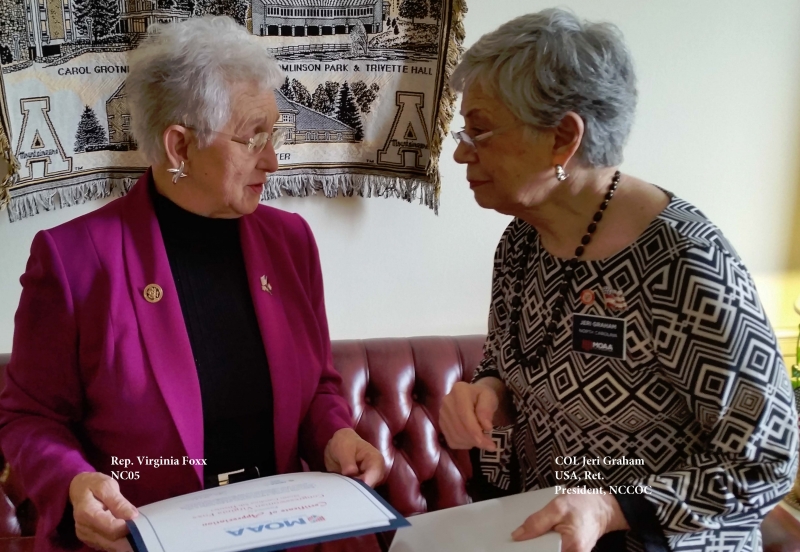 * The team provided information on MOAA’s position on the Military Compensation and Retirement Modernization Commission’s 15 recommendations and the inequities affecting National Guard members and Reservists, disabled retirees, and survivors. Other specific concerns shared were about North Carolina military installations and veterans issues.